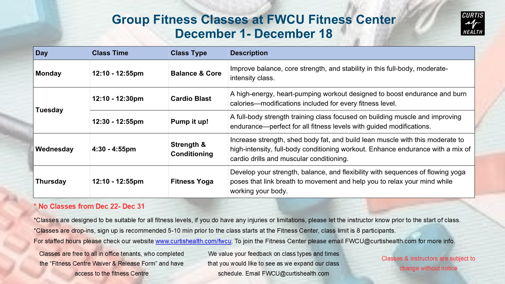 Curtis Health will be offering drop in Group Fitness Classes for the office tenants in the FWCU building. You need to have completed the application and waiver for access to the Fitness Centre and the orientation prior to attending the classes. For everyone’s safety the size of the classes are limited because of the size of the area available for fitness class. Space is available on a “first come first serve” base, the sign up sheet for that day’s class will be put out 10 min prior to the start of class, and participants must be present (and remain in the fitness centre) to sign up.